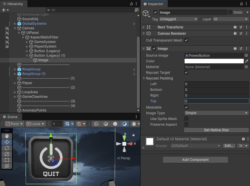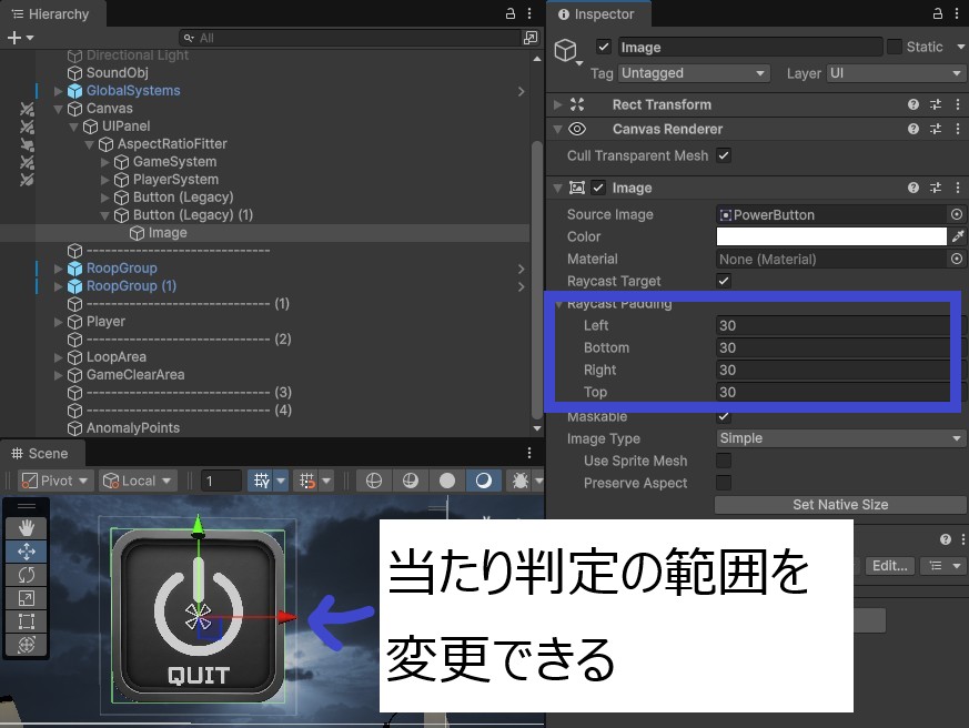 結論からいうと、ImageのRaycast Paddingという項目を調整することで、当たり判定を調整することができます。
